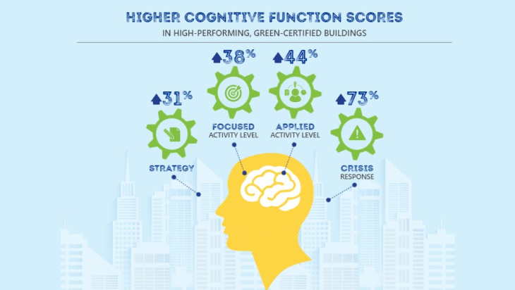 A green workspace can help prevent the above from happening, boost cognitive thinking, and restore involuntary attention deficit in professionals. A study on green buildings substantiates that occupiers of such spaces attained 26% higher cognitive function scores on various scales than those in conventional work environments.